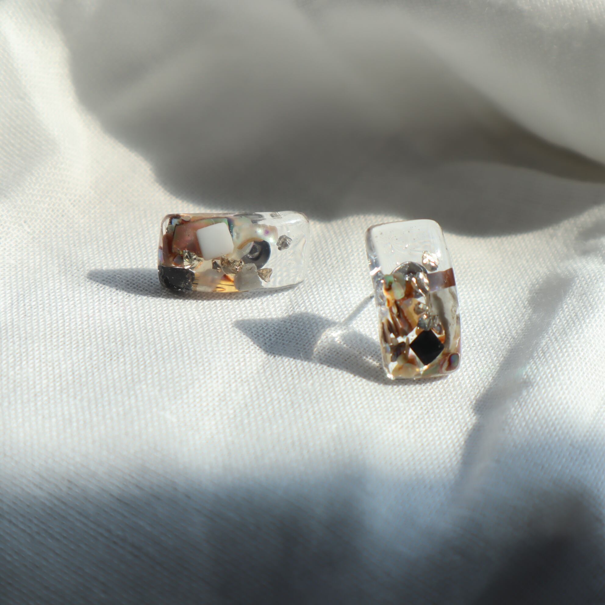 【Arakawa series】荒川河川敷に多く落ちているモノトーンのマイクロプラをいかしたデザインです。クリアにグラデーションにして ”河川や海がキレイになっていきますように”という想いを表現しています。※ピアスパーツはサージカルステンレスを使用しています。