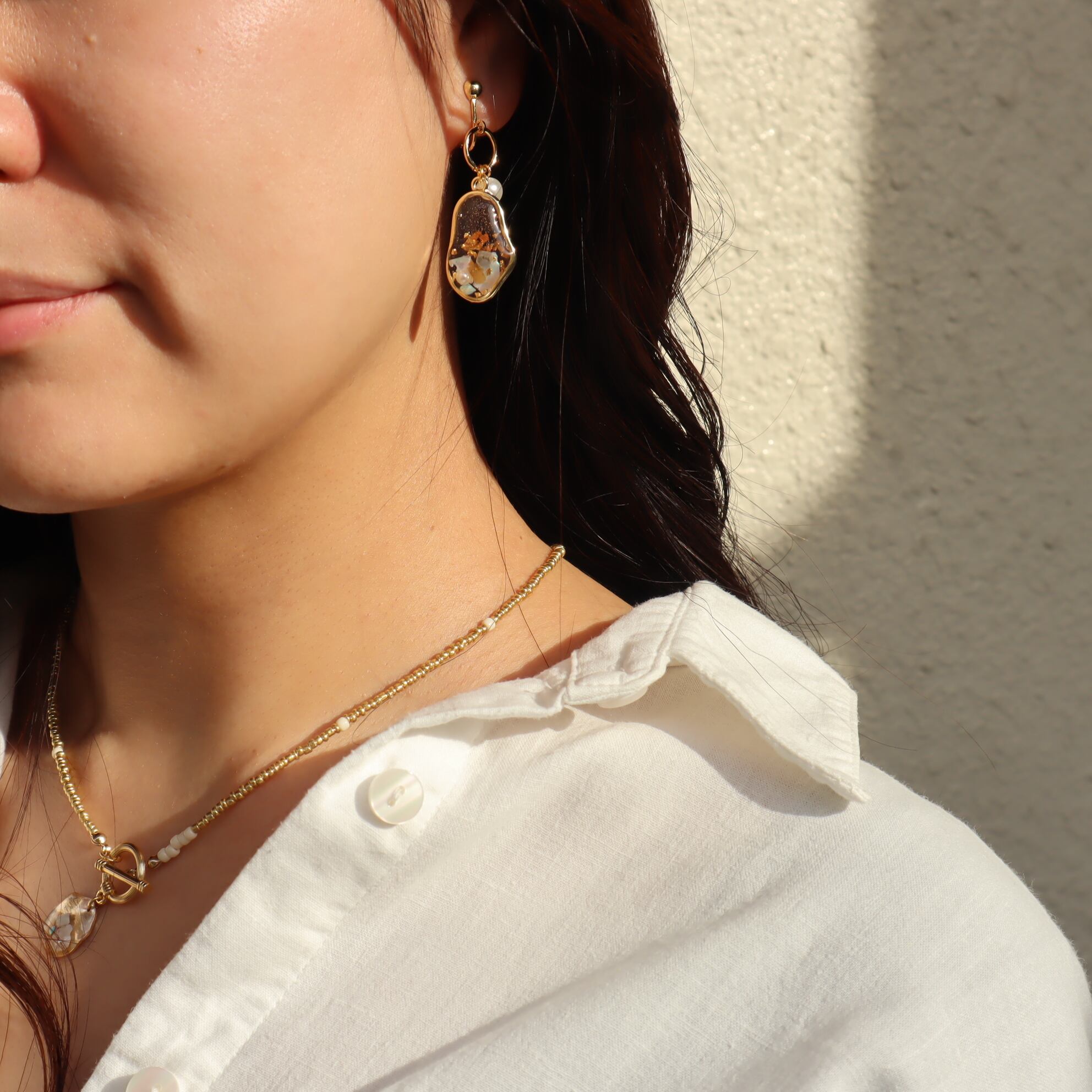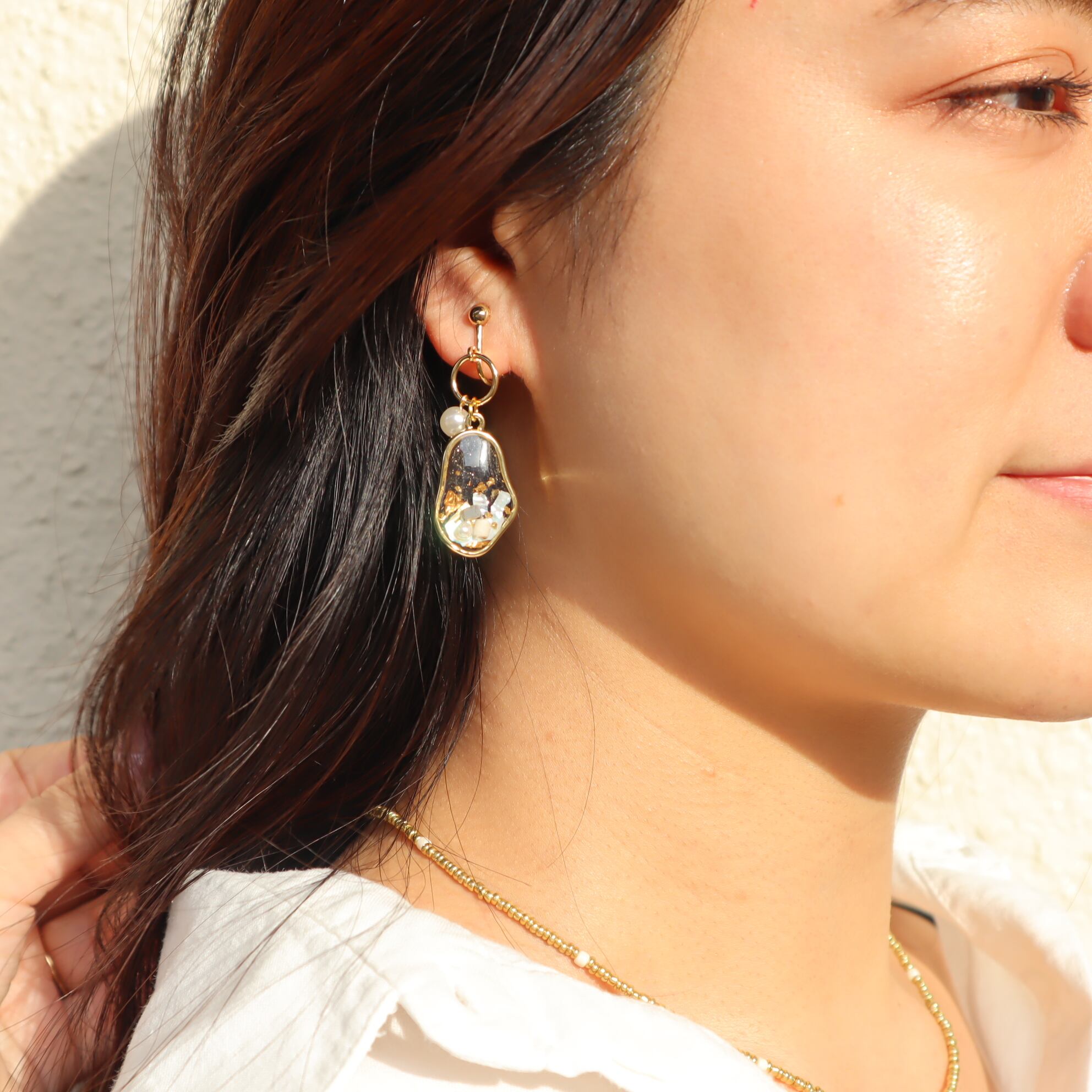 goldの変形フレームにグレーのマイクロプラスチックとパールがマッチしてオトナな雰囲気。ゆらゆら揺れる可愛いアクセサリー。