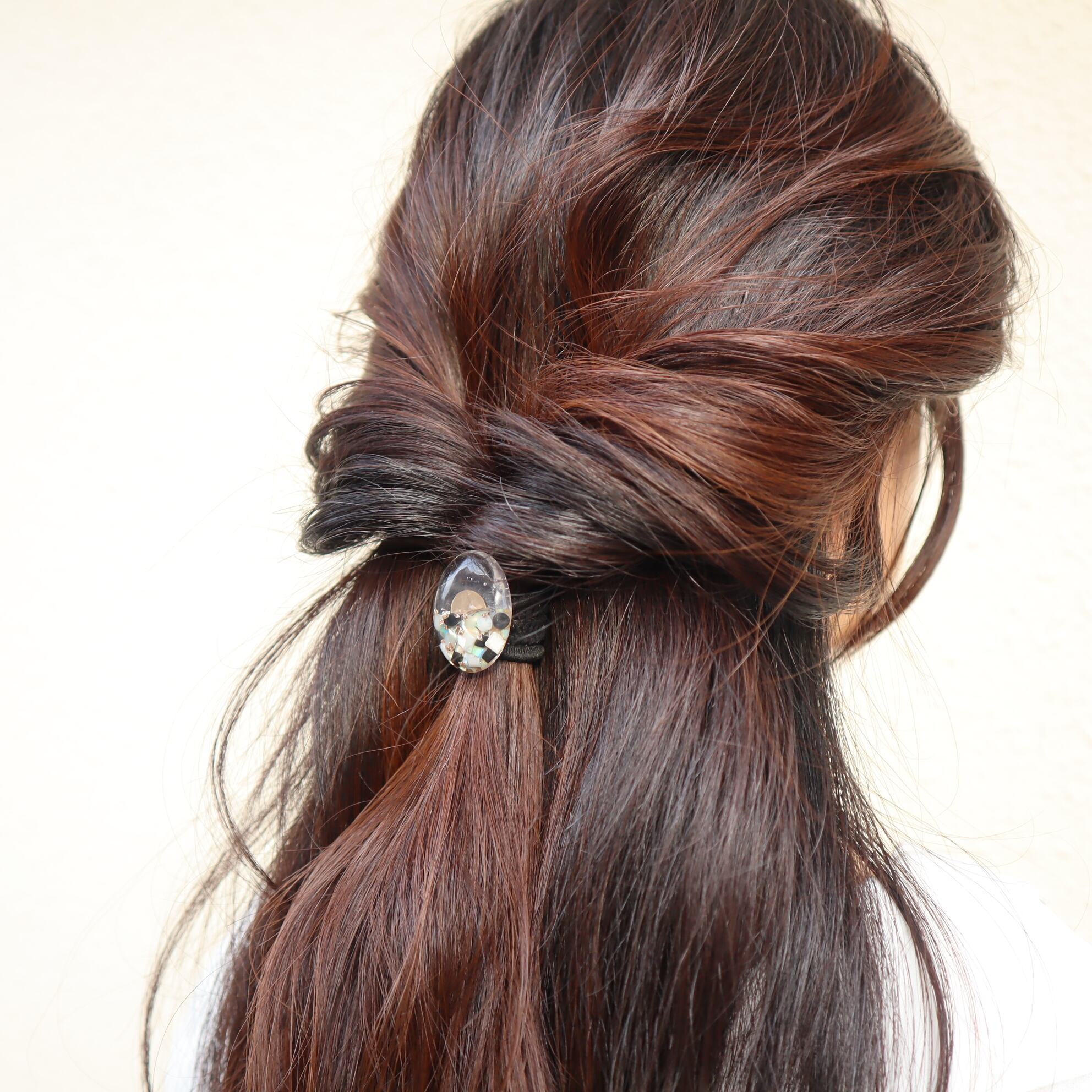 【Arakawa series】荒川河川敷に多く落ちているモノトーンのマイクロプラをいかしたデザインです。クリアにグラデーションにして ”河川や海がキレイになっていきますように”という想いを表現しています。ヘアゴムはブラックです。