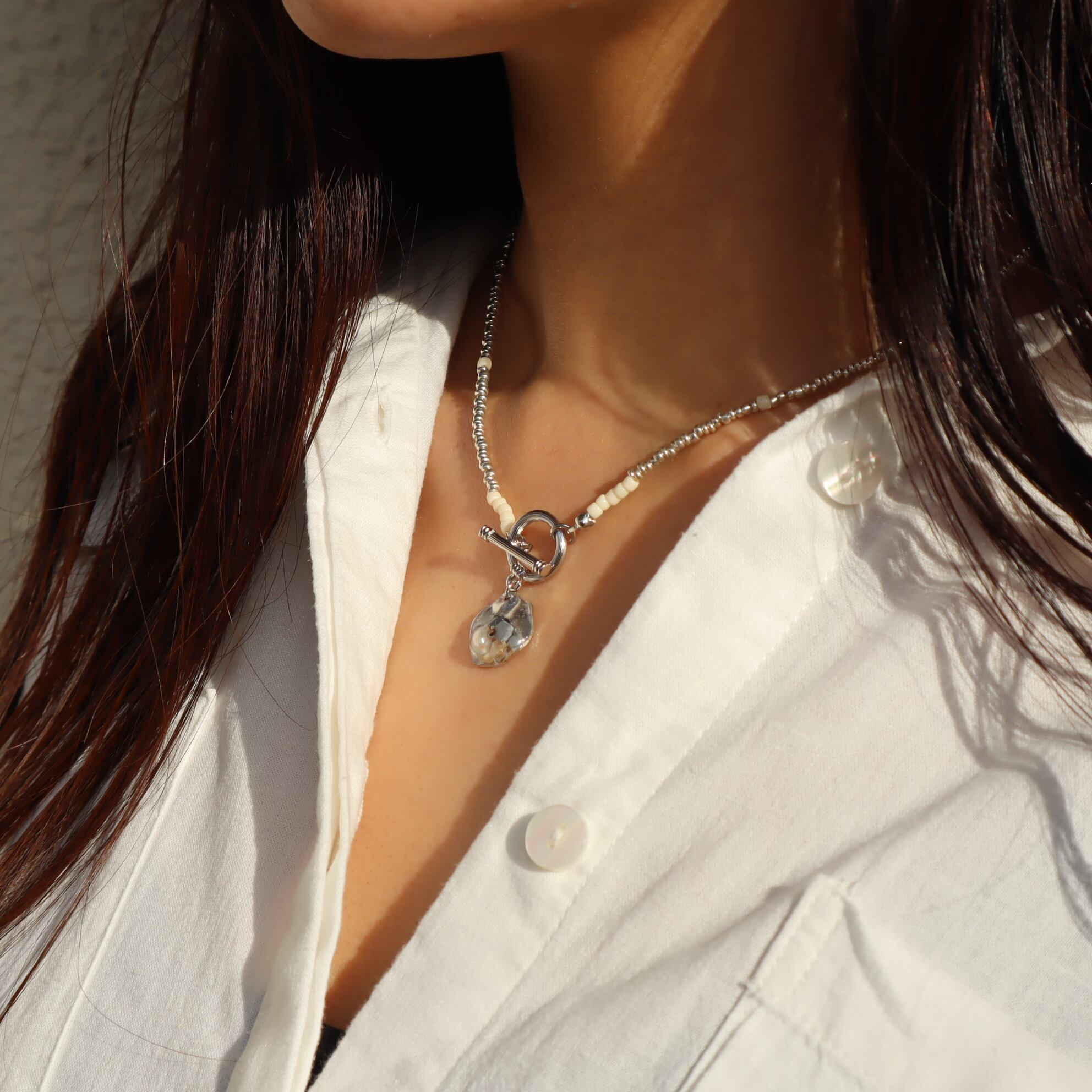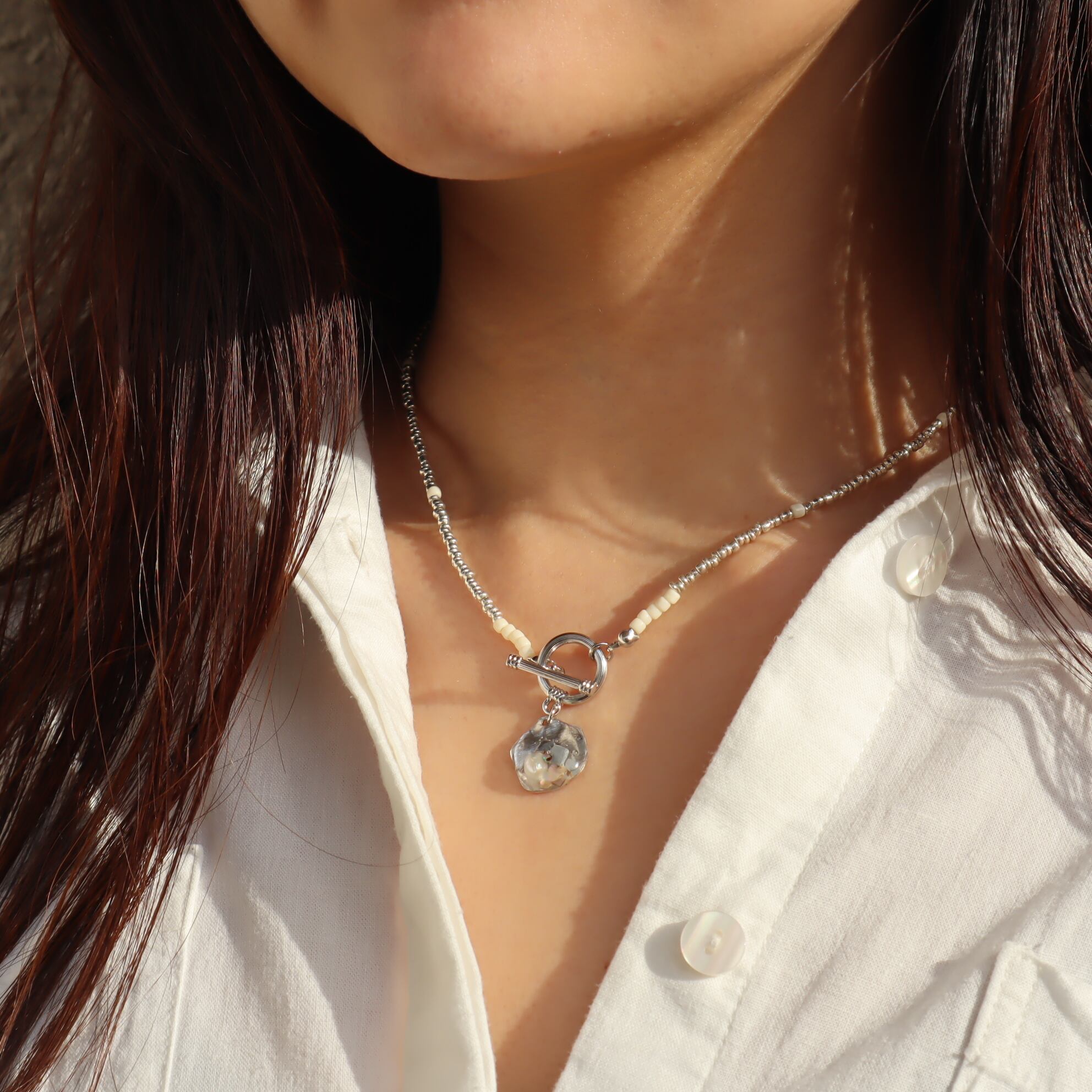 マンテル(留め具)をフロントにしたことで着脱しやすく、ビーズなのでお肌の弱い方もつけやすいネックレスです。トレンド感あふれるアイテム。