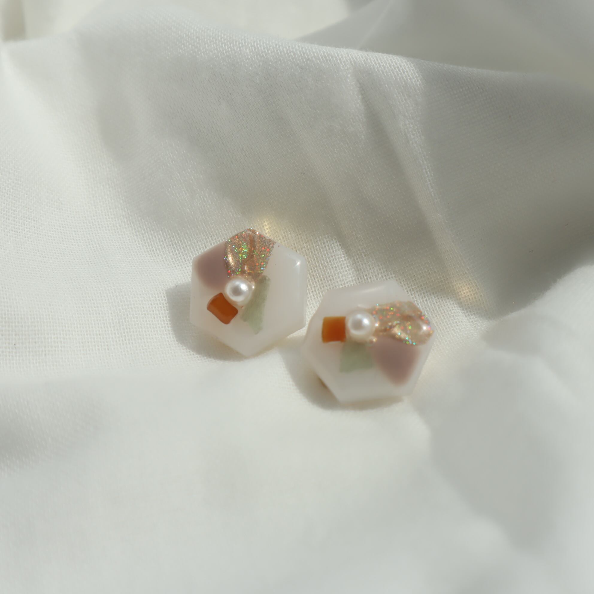 milkyベースに優しいグリーンやキャメルのマイクロプラをのせ、ニュアンスカラーとミラーパウダーで仕上げました。春にとけこむアクセサリー。