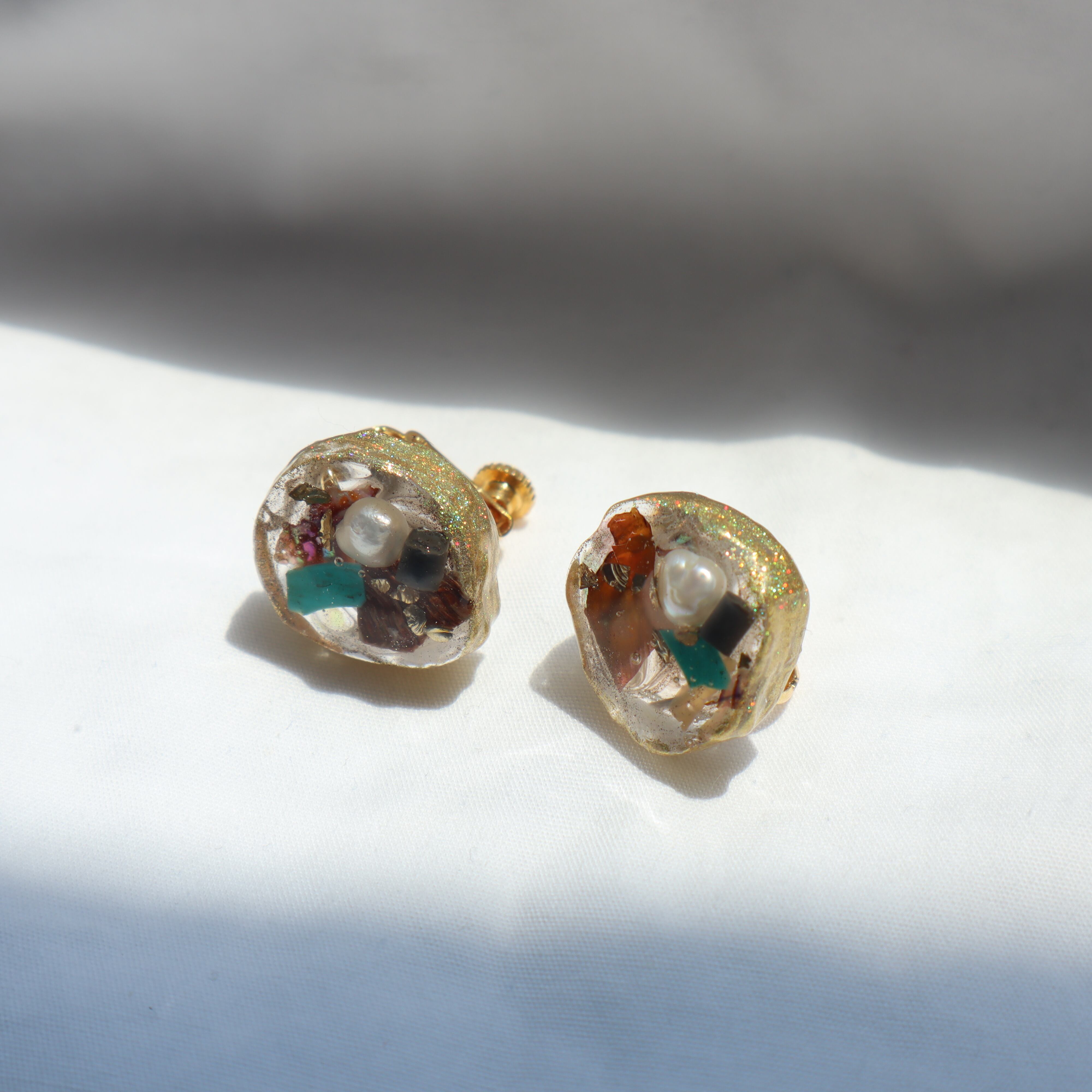 存在感のある大きめのアゲートスライス型のイヤリングです。ターコイズのマイクロプラを入れて大人っぽく仕上げました。